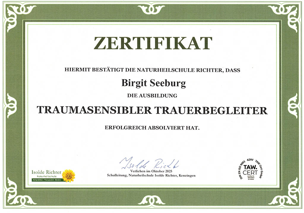 - Zertifizierte Therapeutische Trauma sensible Trauerbegleiterin / Heilpraktikerschule Isolde Richter Kenzingen